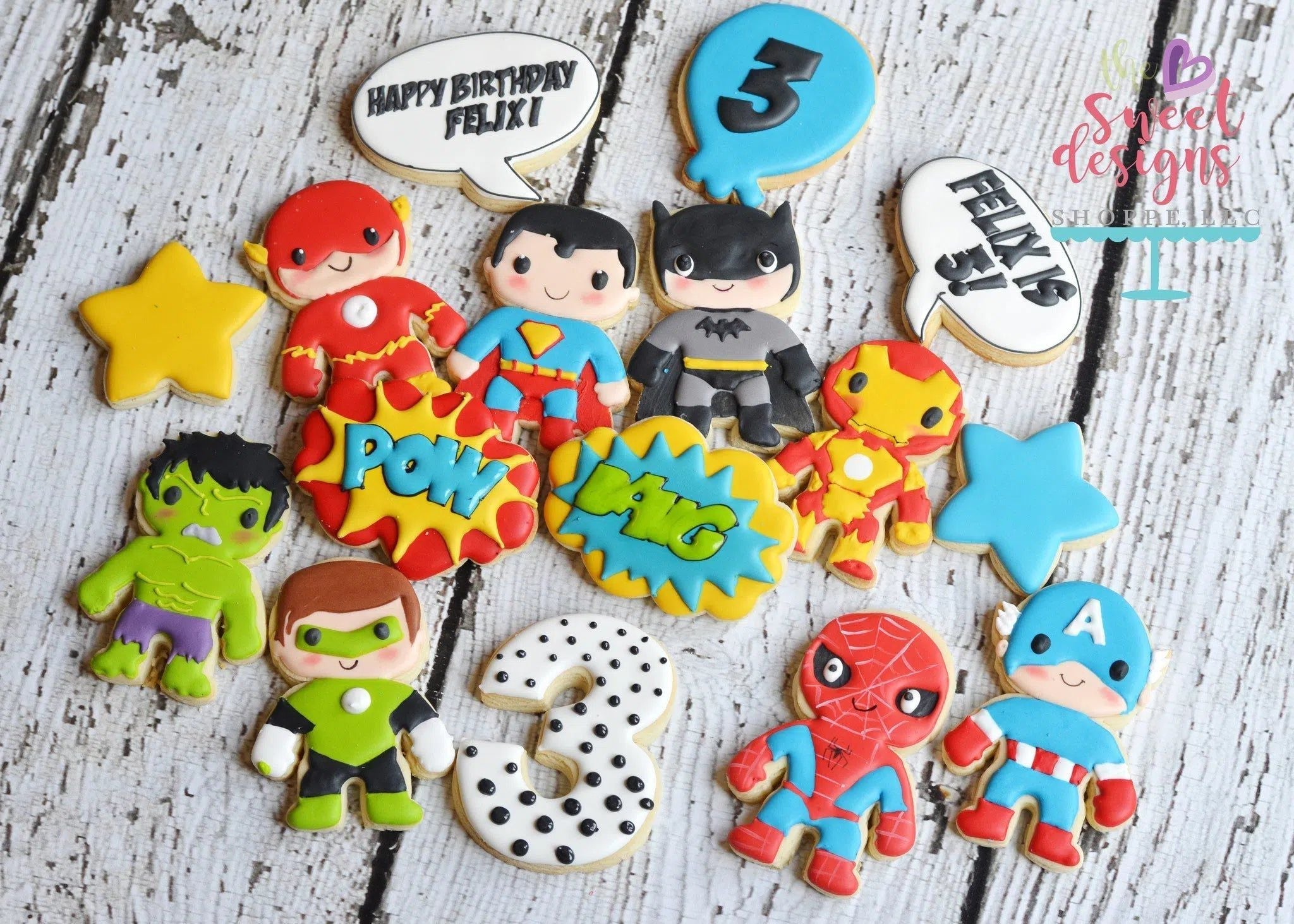 These Superhero Cookies Collection was created for one of my twins 3rd birthday. This particular Cookie cutter can be modified with small changes to have any superhero without cape. Remove the head wings for a superhero with helmet or ears, or remove head wings and square sides for a round head only superhero.